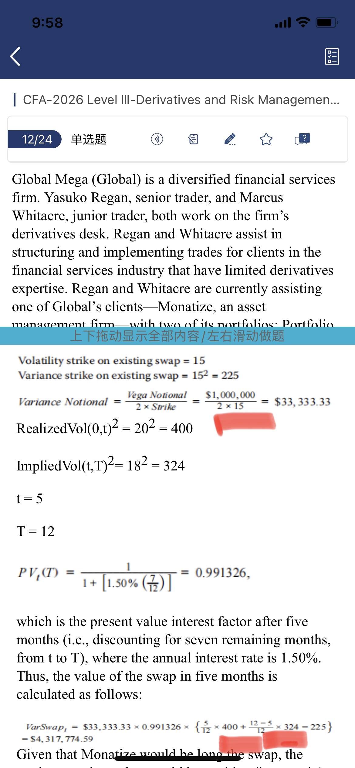 Variance Notional=Vega Notional/(2*Strike),Strike不需要加%,,18%的平方也不需要加%,VarSwap= Variance Notional* PV T*(),是先算Variance Notional,再算括號里面的,而不是將兩者放在一起算,,,,總之,做題時直接將%去掉就可以了,